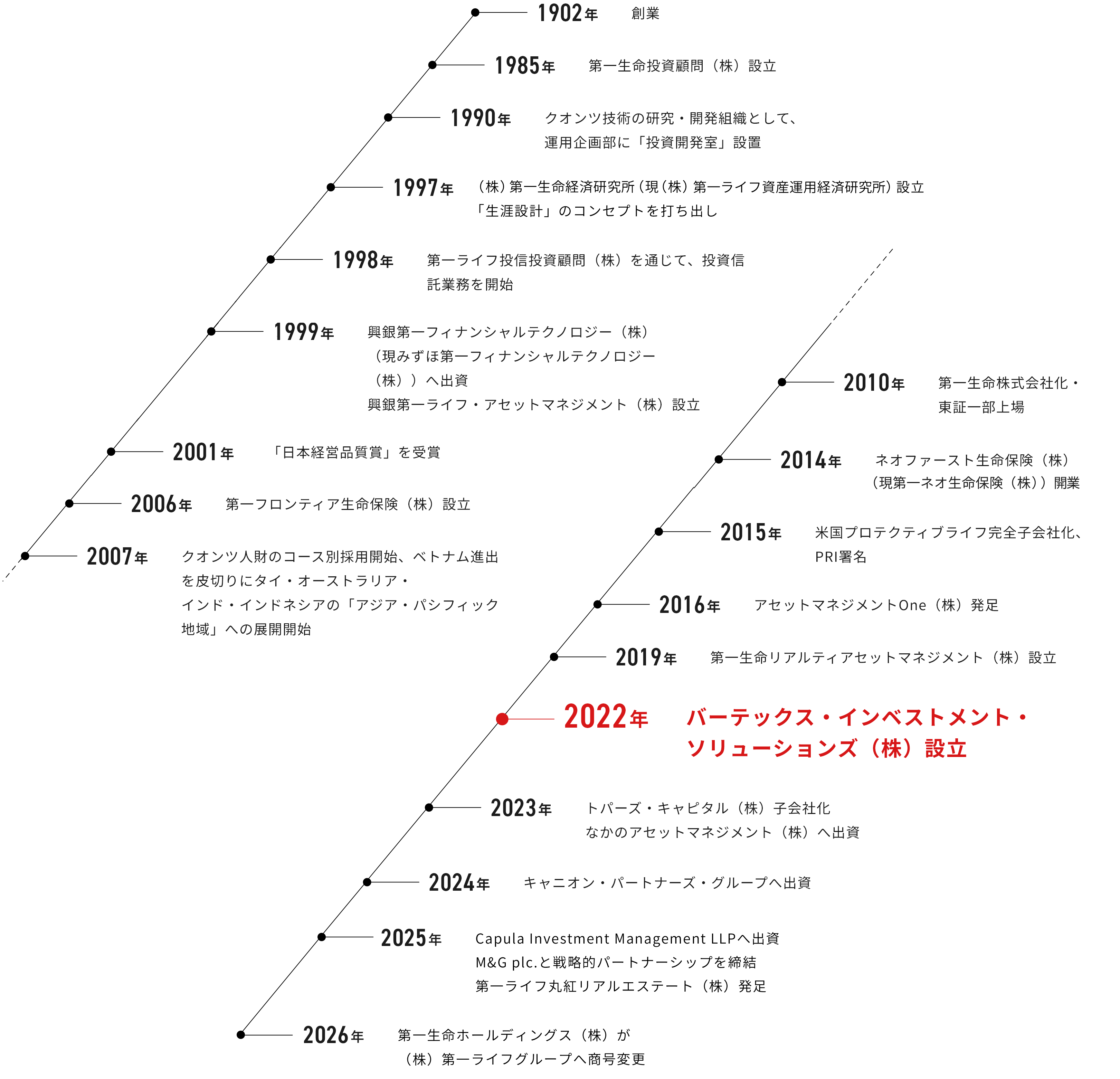 Daiichi Lifeグループが創業以来、そして高度経済成長・バブル崩壊・金融危機・デフレの進展といった激動の時代を乗り越えながら培ってきたもの、「長期投資の知見」と「金融テクノロジー」を継承し、バーテックス・インベストメント・ソリューションズは、革新的な資産運用会社としてイノベーションを創出し続け、お客さまに最良のソリューションをご提供します。