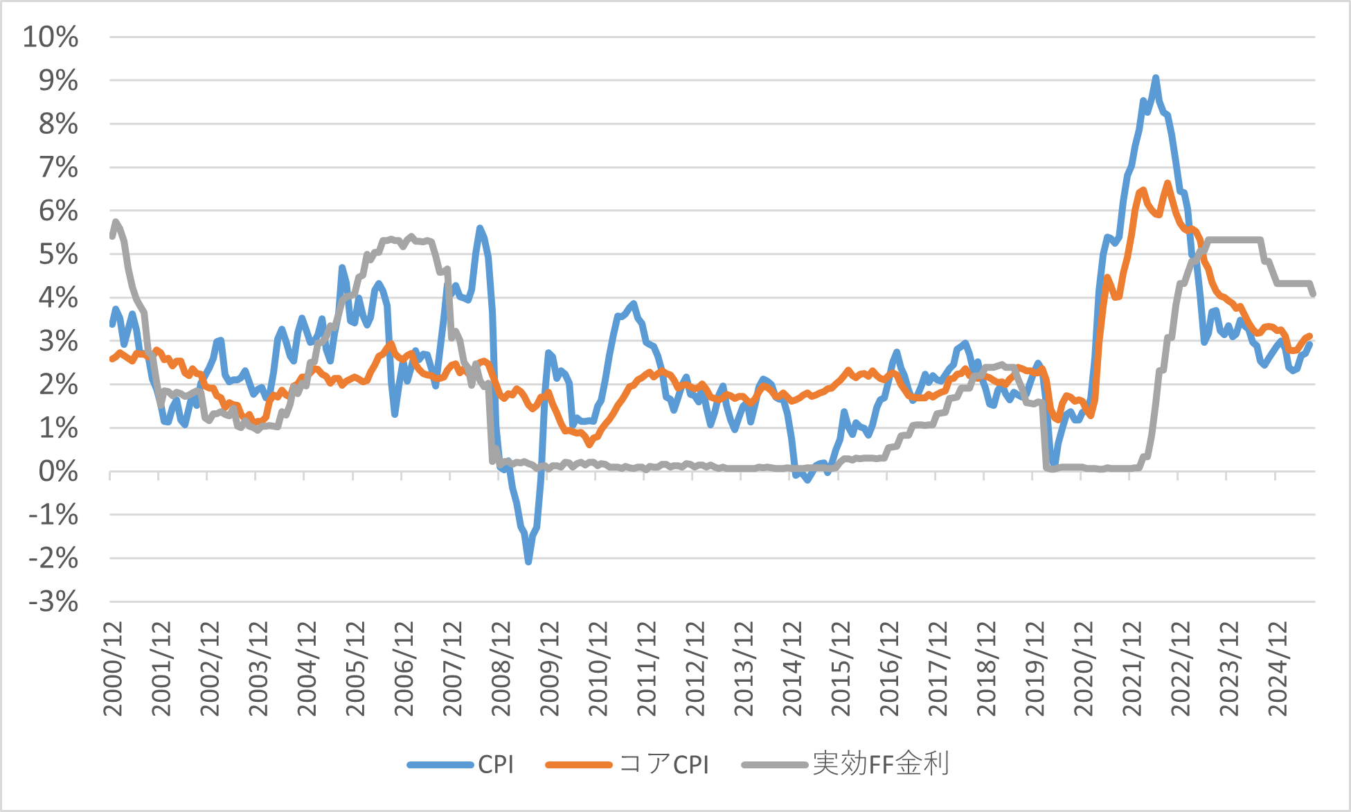 図1:米CPI(前年比)と実効FF金利の推移