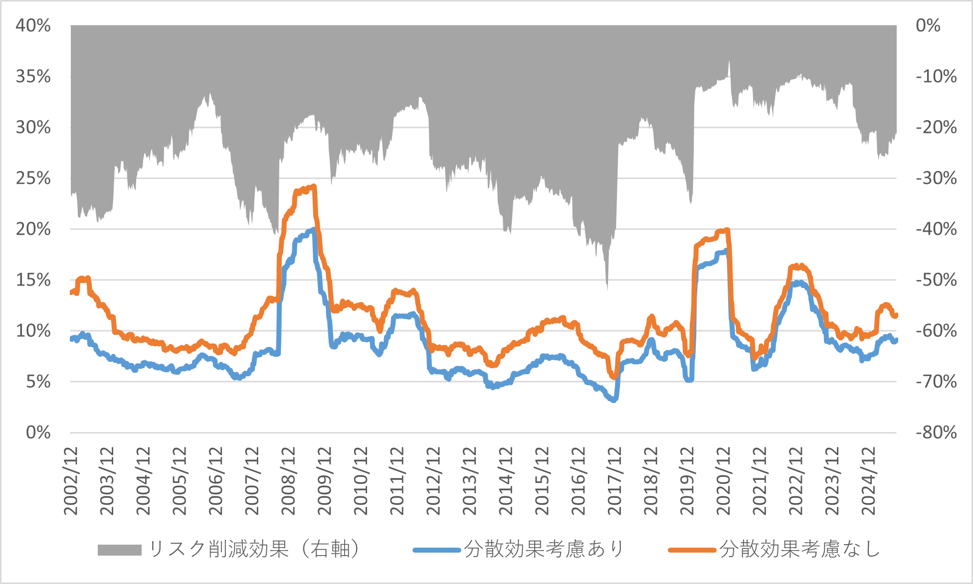 ※Bloombergのデータをもとにバーテックス・インベストメント・ソリューションズ作成図3: 米国株式・米国債50/50ポートフォリオのリスクと分散効果によるリスク削減率